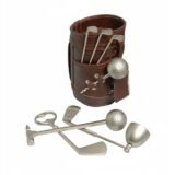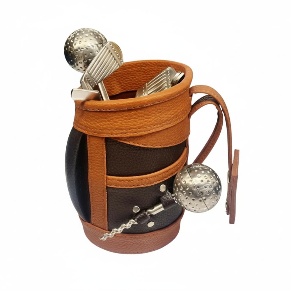 Premium golf-themed bar tool set crafted in a stylish leather holder with stainless steel accessories. Includes cocktail tools designed with a unique golf ball finish, combining elegance and functionality. Ideal for home bars, travel, or gifting to golf lovers and cocktail enthusiasts.