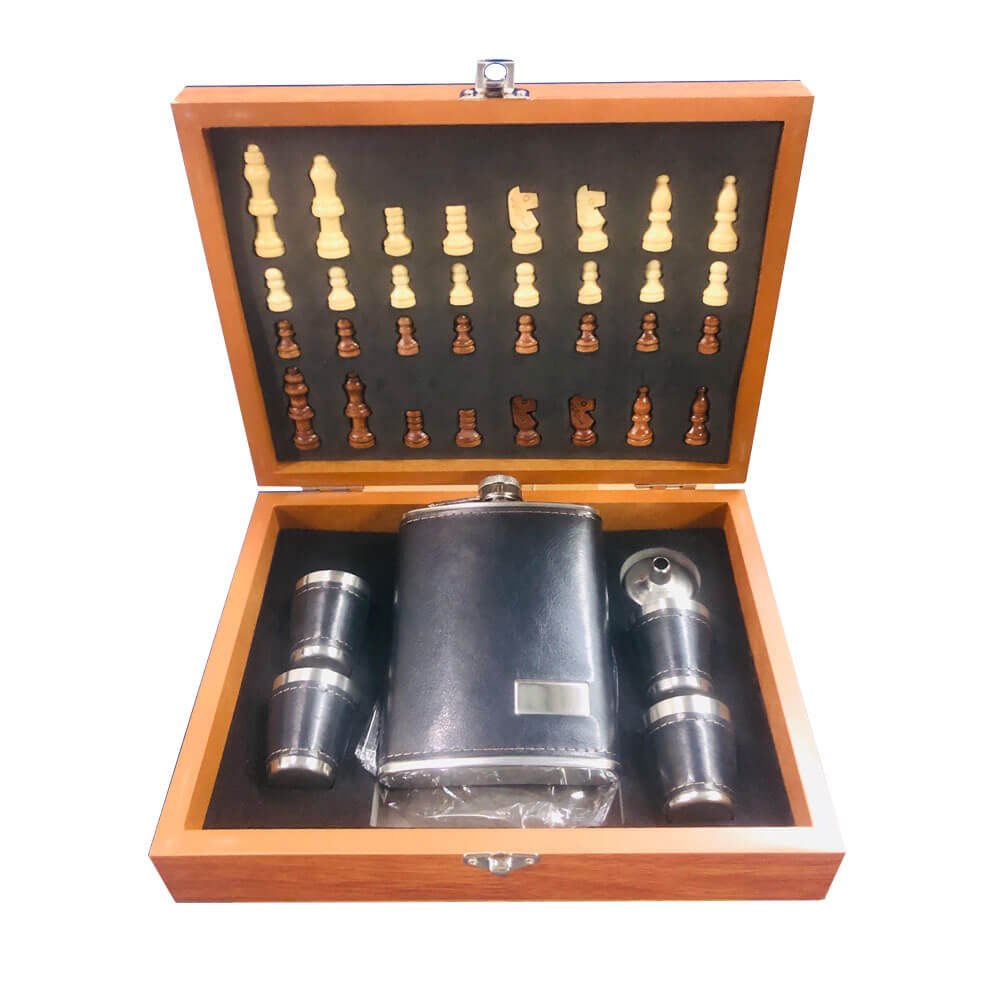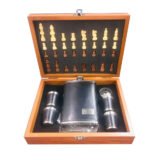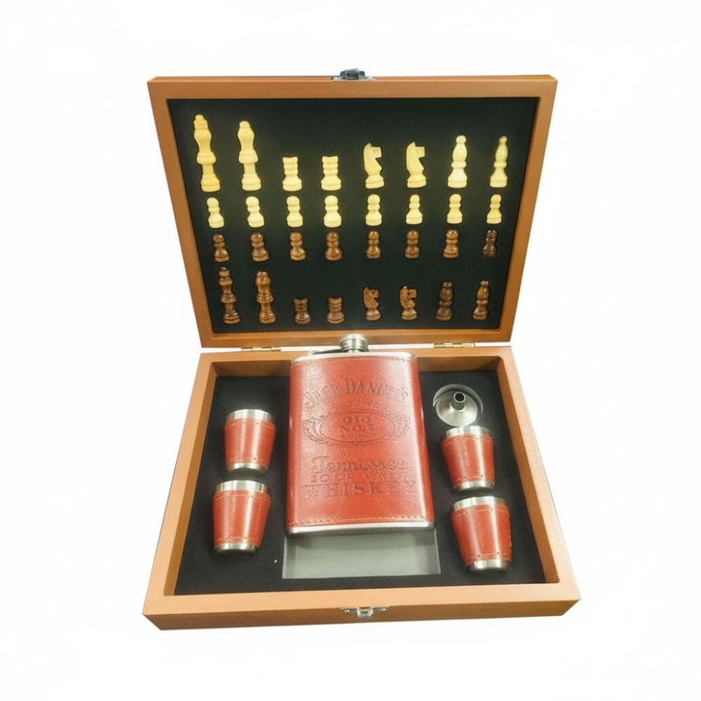 An elegant multi-purpose gift set combining a classic chess board with a premium hip flask and matching shot glasses. Crafted in a wooden storage box, this stylish set is perfect for chess lovers and whiskey enthusiasts. Ideal for gifting, travel, celebrations, and home décor.