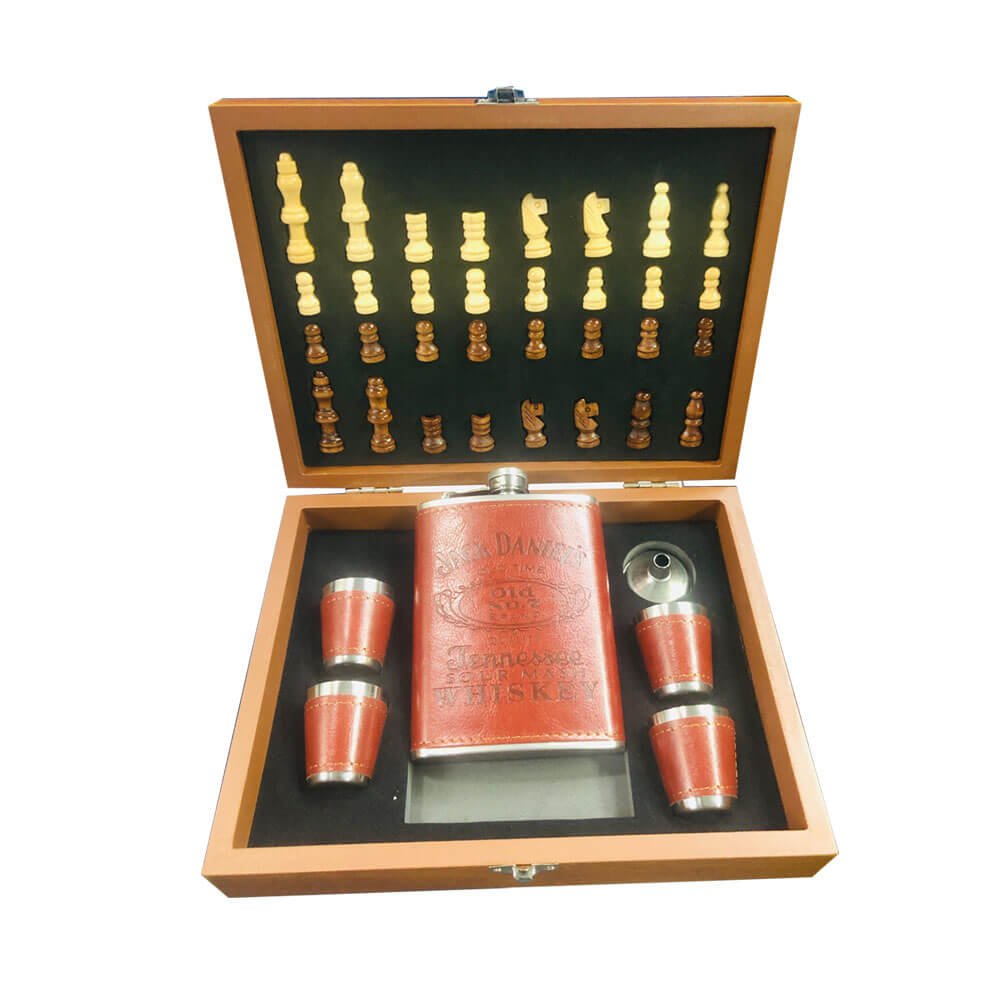This Luxury Chess Board Hip Flask Gift Set is a unique blend of entertainment and elegance. Designed inside a premium wooden box, the top lid features a complete chess piece set neatly arranged for classic gameplay. The lower compartment houses a high-quality stainless steel hip flask wrapped in a rich leather finish, along with four matching shot glasses and a funnel for easy pouring.