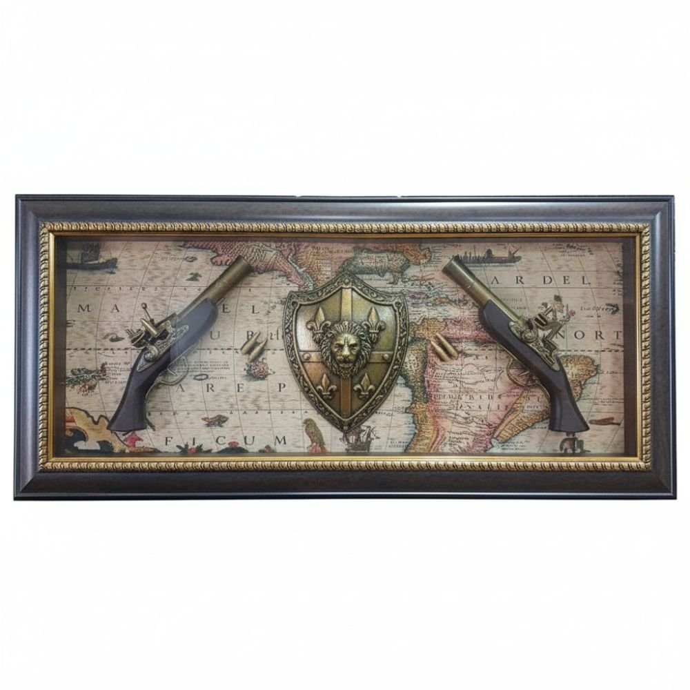 Wooden Brown Gun Scenery Frame is a premium decorative showpiece featuring a detailed gun and bullets arrangement inside a glass frame box. Designed in a classic wooden brown finish, it adds bold character, heritage appeal, and unique style to offices, homes, and display areas.