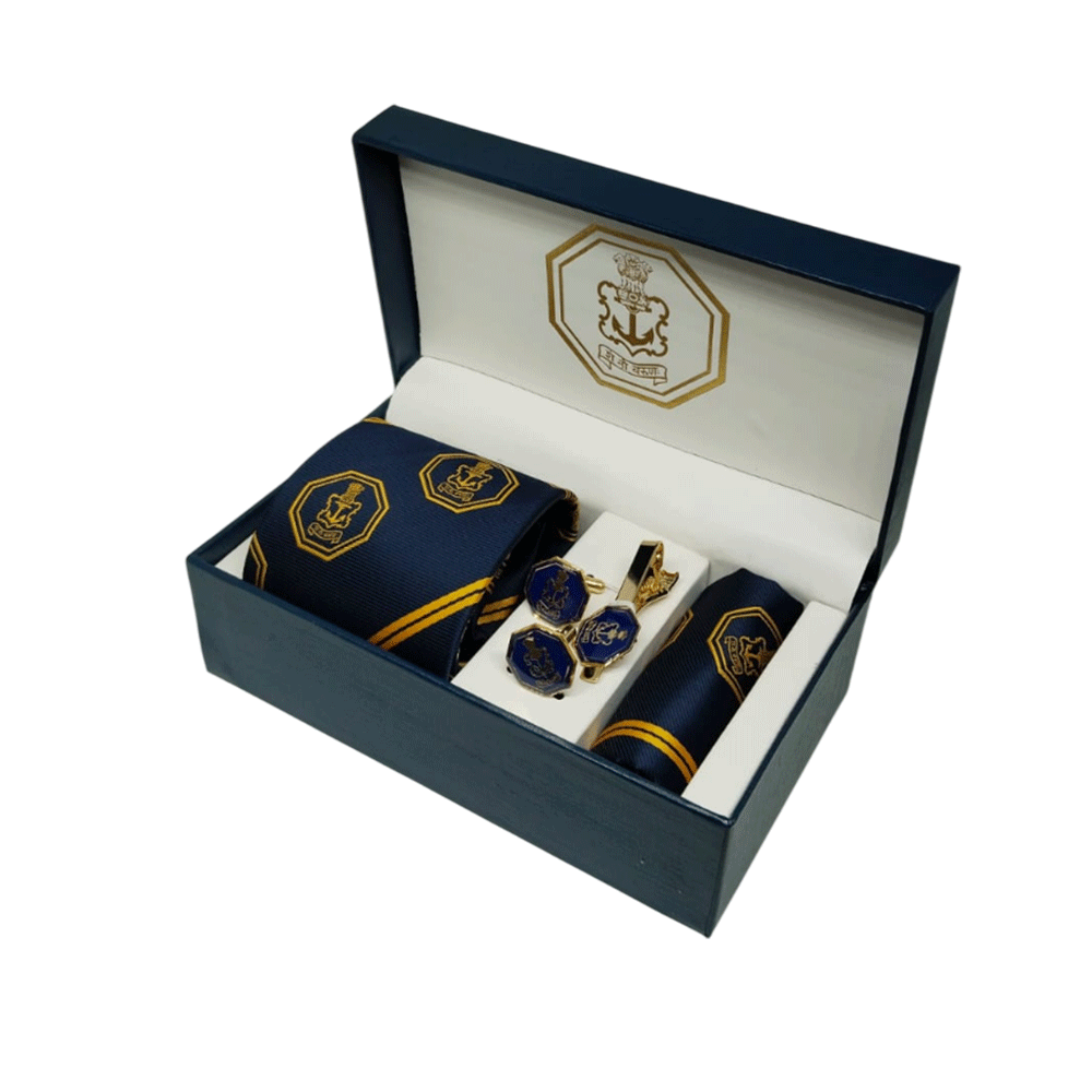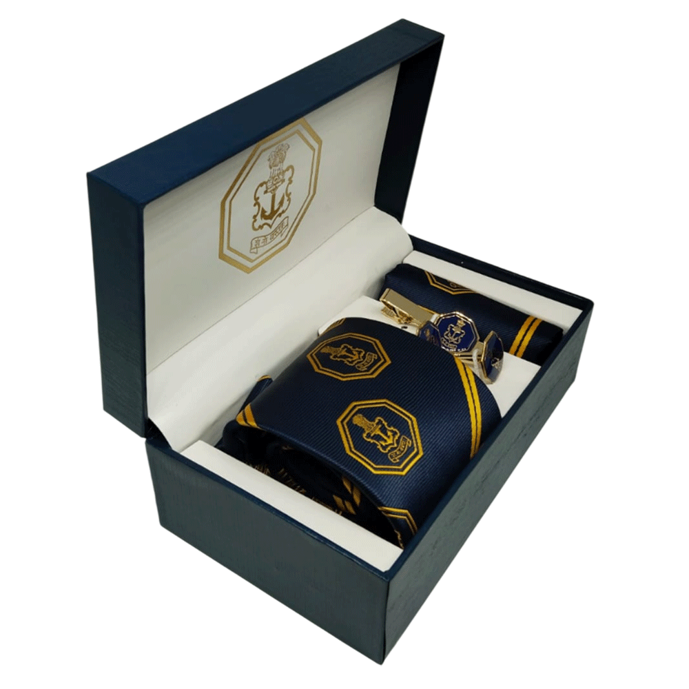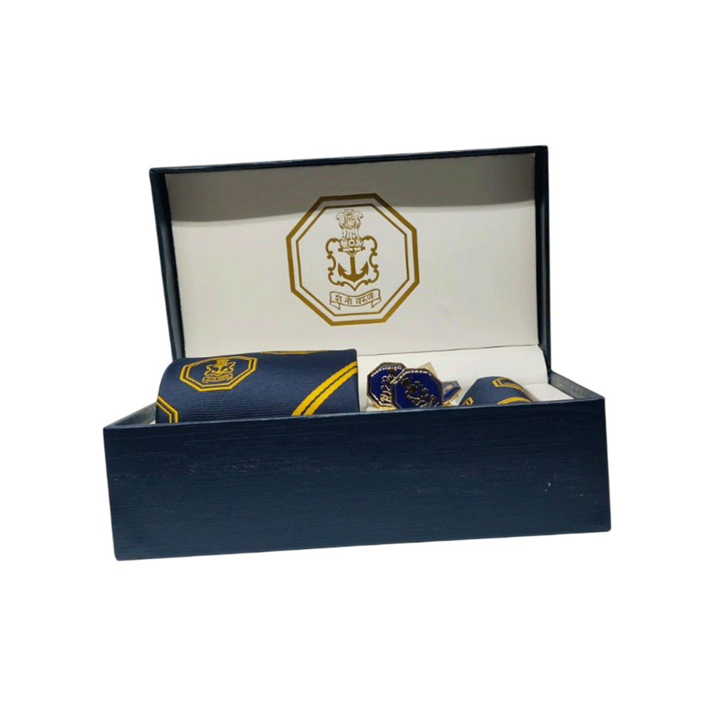 Beautiful Navy blue fabric used for making tie with Indian Navy logo weaved into the fabric. It is durable, elegant, Honorable and prestigious tie for all Naval personnel.