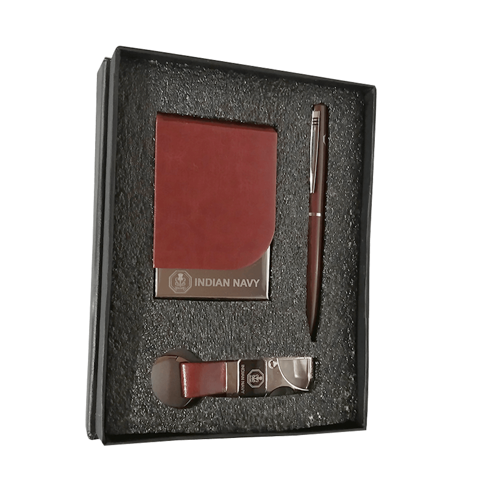 Elegant 3-in-1 gift set featuring a card holder, pen, and keychain with the engraved Indian Navy emblem – perfect for corporate gifts, special occasions, or Navy pride.