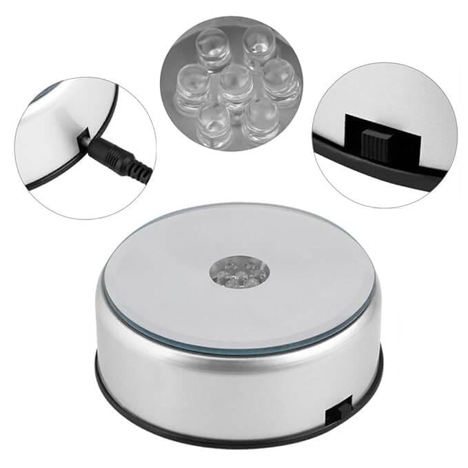 360 Degree Rotating LED Display Base Stand for Crystals, Glass Art, Jewelry & More, Silver Metal Pedestal Display Stand