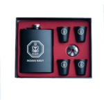 Indian Navy Logo Engraved Hip Flask with 4 Shot Glasses & Funnel – Stainless Steel Black 9 Oz/266 Ml