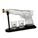 - Give your liquor collection a new way to shine! This Glass wine decanter and two shot glasses is the coolest way to add some style to your bar. This glass is not only a great gift, but it will also look stunning on any bar. With the elegance of the crystal decanter and the machismo of the handle, this will be a great gift for any whiskey lover or enthusiast. The perfect addition to any home bar, office setting, club or organizations display cabinet.